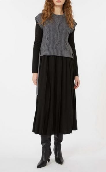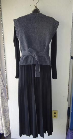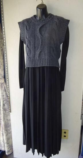 ★ケーブル編みのニットジレと、ジャージードレスのツーピースワンピースは、ストレッチの効いたドレープ性のある生地使用のソフトで快適な着心地と、ややハイウエストの切り替えで、上品なプリーツをあしらったフレアシルエットがポイント。ケーブル編みのニットジレは、サイドに縫い付けられたベルトを後ろで結んで、フィット感を調節が可能、それぞれ単品でもお楽しみいただける活用度の高いアイテムです。